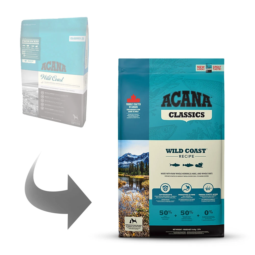 ACANA™ Wild Coast enthält nahrhaftes Protein und Omega-Fettsäuren von wild gefangenem Hering und Seehecht. Für die Unterstützung von gesunder Haut und glänzendem Fell.
