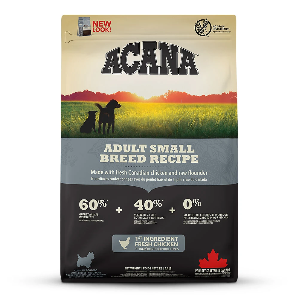 Acana Dog Adult Small Breed ist das ideale Futter für Hunde kleiner Rassen, reich an Proteinen, sowie mit angepasstem Fettgehalt und arm an Kohlenhydraten. Es enthält keinen Weizen, Mais oder Gluten-Bestandteile, die häufig Magen-Darm-Störungen auslösen können. Stattdessen enthält Acana Dog regionales Obst, Gemüse und geschroteten Hafer – niedrig glykämische Kohlenhydrate, die nur wenig Einfachzucker enthalten, der zu erhöhten Blutzuckerwerten und Übergewicht bei kleinen Rassen führt. Frischer Lachs ist eine wertvolle Quelle essenzieller Fettsäuren (EPA, DHA) und sorgt für eine gesunde Haut und ein prächtiges Fell – die äußeren Merkmale Ihres Hundes für Vitalität.