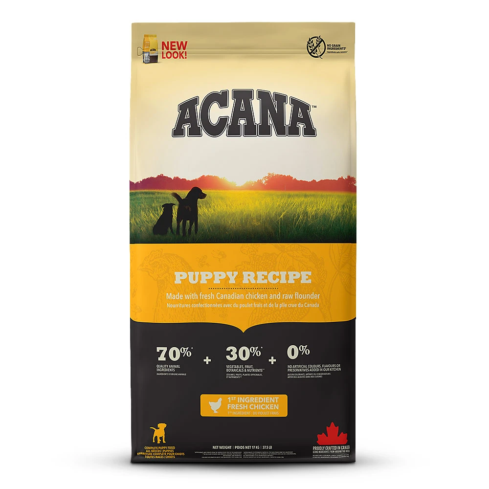 Acana Dog Puppy ist ein natürliches Trockenfutter für Welpen aller Hunderassen. Die Rezeptur basiert überwiegend auf Fleisch und enthält nur wenige Kohlenhydrate auf Kartoffelbasis. Frische Volleier von regionalen Farmen, Fleisch von frei laufenden Hühnern und Flunder werden täglich frisch, ungefroren und ohne Konservierungsstoffe angeliefert. Obst, Gemüse und wertvolle Kräuter runden die Rezeptur von Acana Dog Puppy & Junior Hundefutter ab und ermöglichen eine natürliche Ernährung Ihres Hundes.
