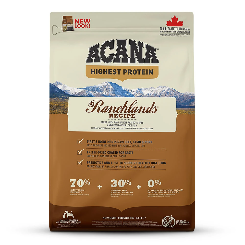 Das Acana Highest Protein Ranchlands Dog Trockenfutter zeichnet sich aus durch: