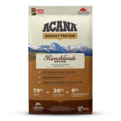 Acana Highest Protein Ranchlands Trockenfutter ist ein besonders schmackhaftes Trockenfutter für Hunde jeden Alters und jeder Rasse. Mit viel leckerem Fleisch und wertvollen Innereien von Angus-Rind, Weidelamm, Yorkshire-Schwein, Bison und Zander sowie leckerem Obst und Gemüse aus Alberta (Kanada). Mit diesem ausgewogenen Trockenfutter wird Ihr Hund mit allen wichtigen Nährstoffen versorgt. Die hochwertigen regionalen Zutaten werden im preisgekrönten Familienbetrieb zu schmackhaften Produkten verarbeitet.