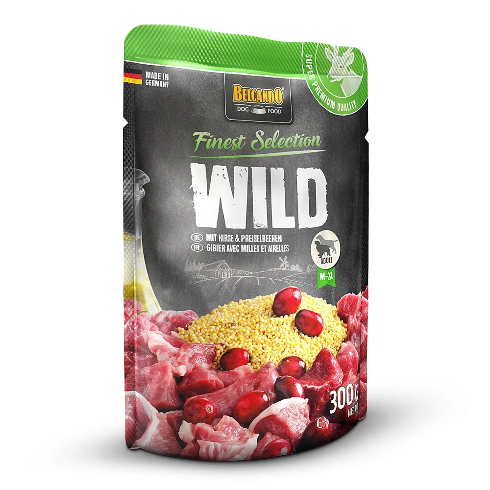 Das Nassfutter Belcando Wild mit Hirse & Preiselbeeren beinhaltet bestes Fleisch, ist mit ausgewählten Zutaten verfeinert und schonend im Portionsbeutel gegart. Das kaltgepresstes Distelöl liefert essentielle ungesättigte Fettsäuren. Außergewöhnlich schmackhaft und bekömmlich eignet sich BELCANDO FINEST SELECTION hervorragend für sensible oder wählerische Hunde.