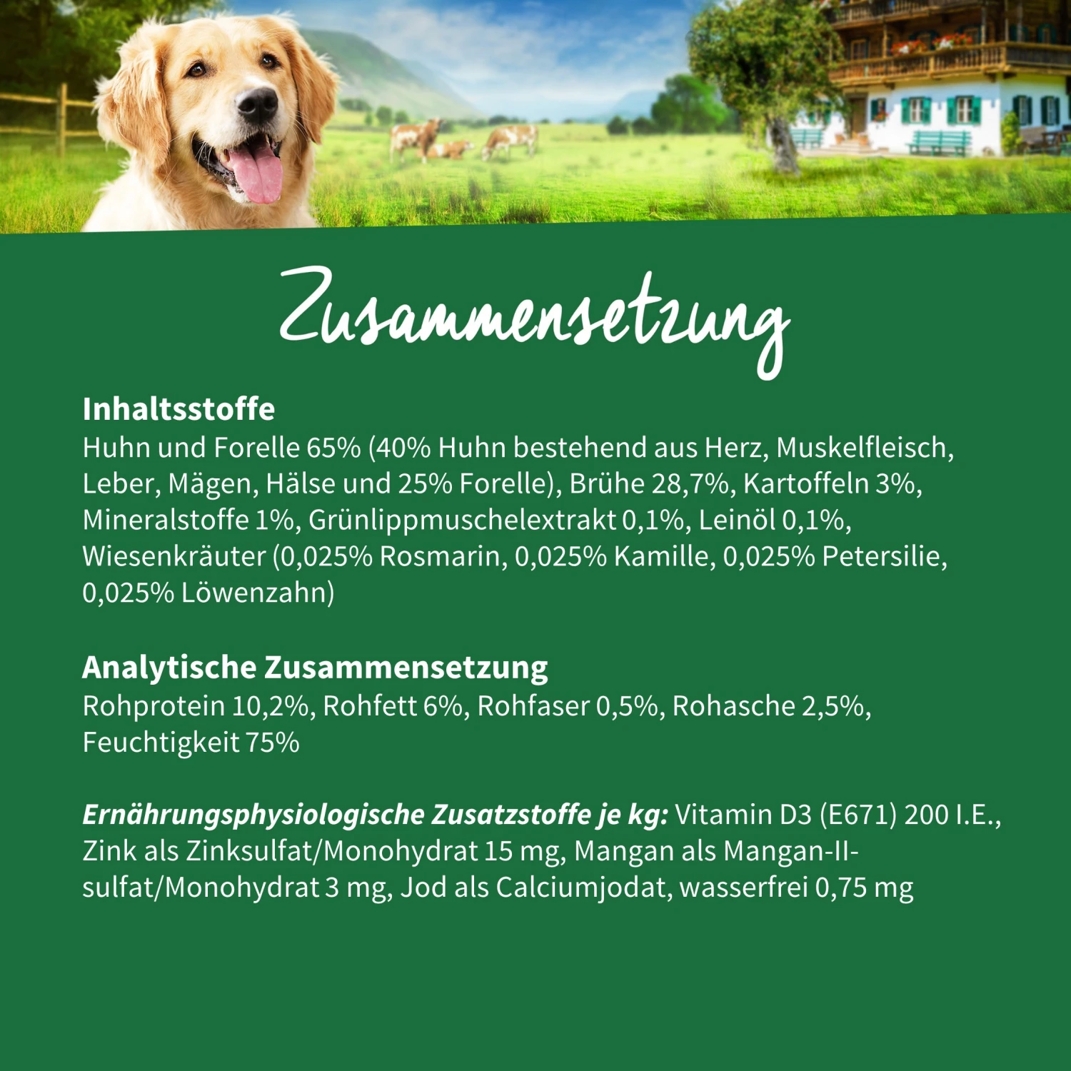 Das Nassfutter Müller’s Naturhof Huhn und Forelle mit Gartengemüse und Wiesenkräutern ist ein qualitativ hochwertiges Alleinfuttermittel für Hunde aller Rassen. Die ausgewogene, getreidefreie Rezeptur vereint leckere Zutaten vom Land und ist dabei besonders artgerecht. Viel frisches Hühnerfleisch sorgt für eine gute Verdaulichkeit und wurde kombiniert mit nahrhafter Forelle. Leckeres Gemüse und wertvolle Kräuter decken den täglichen Nährstoffbedarf Ihres Hundes auf natürliche Weise und machen das Nassfutter von Müller’s Naturhof besonders schmackhaft.