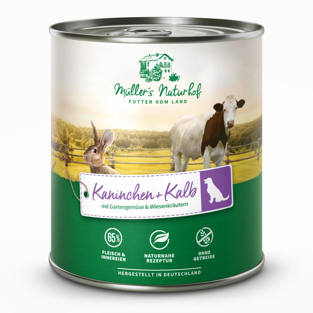 Das Nassfutter Müller’s Naturhof Kalb und Kaninchen mit Gartengemüse und Wiesenkräutern ist ein qualitativ hochwertiges Alleinfuttermittel für Hunde aller Rassen. Die ausgewogene, getreidefreie Rezeptur vereint leckere Zutaten vom Land und ist dabei besonders artgerecht. Viel frisches Fleisch vom Kalb wurde vereint mit herzhaftem Kaninchenfleisch. Leckeres Gemüse und natürliche Kräuter decken den täglichen Nährstoffbedarf Ihres Hundes auf natürliche Weise und machen das Nassfutter von Müller’s Naturhof besonders schmackhaft.