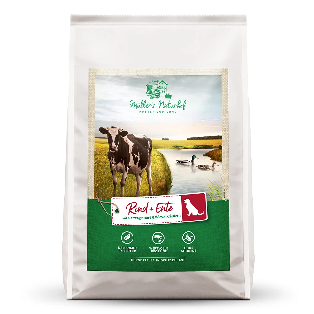 Müller´s Naturhof Rind und Ente eignet sich für ausgewachsene Hunde aller Rassen.
