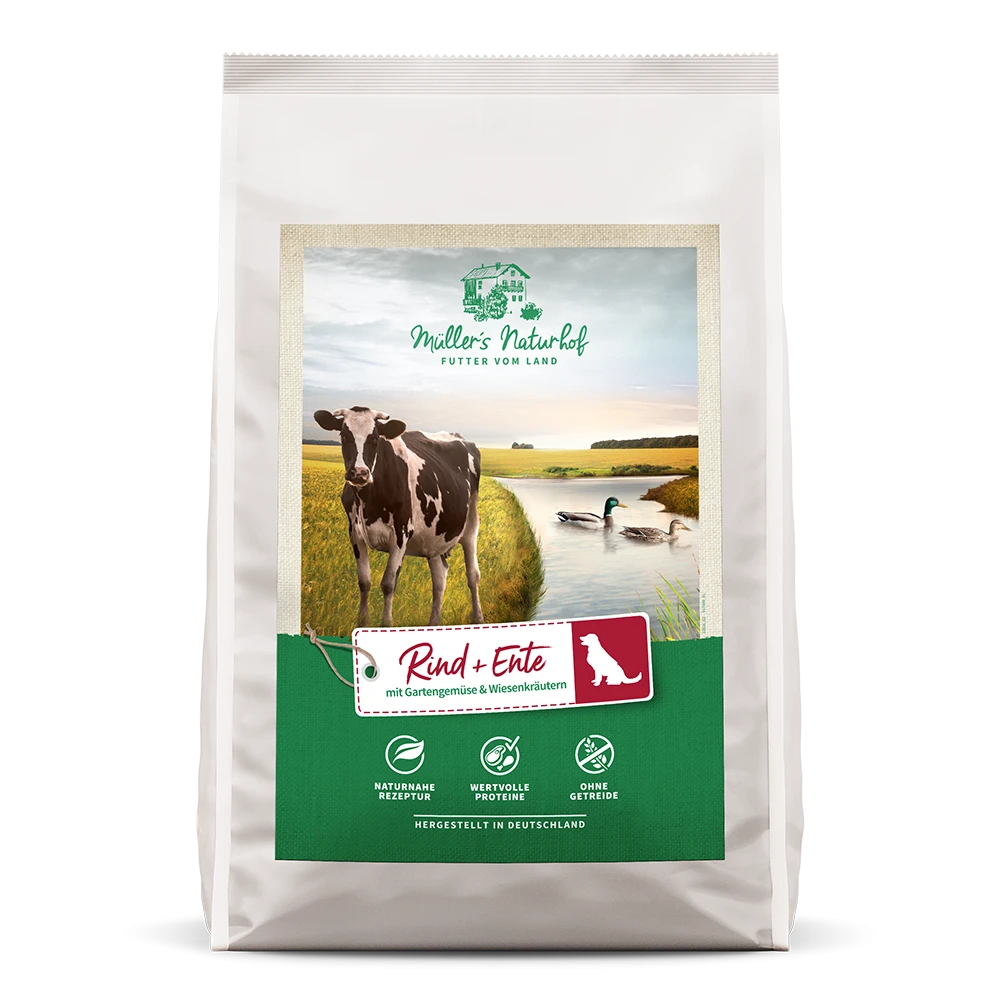 Müller´s Naturhof Rind und Ente eignet sich für ausgewachsene Hunde aller Rassen.