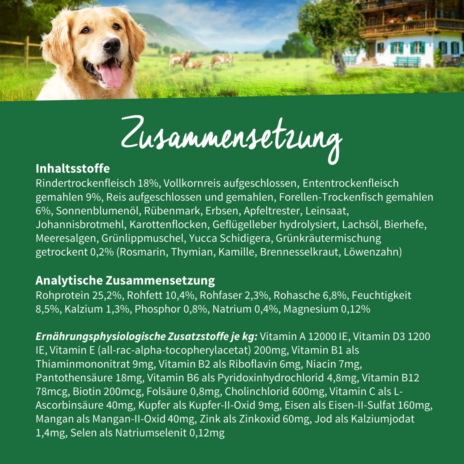 Gerade bei Trockenfuttern ist es oft nicht leicht, das passende für seinen Vierbeiner zu finden. Deshalb vereint Müller’s Naturhof im Alleinfutter Weiderind leckeres Rinderfleisch, verfeinert mit leicht verdaulicher Ente, köstlicher Forelle und Wiesenkräuter. Die naturnahe Rezeptur, die dank der schonenden Herstellungsmethode des Kaltpressverfahrens alle wichtigen Nährstoffe, Vitamine sowie die Qualität behält, überzeugt mit hochwertigen Zutaten. Statt minderwertigem Getreide wird Vollkornmais- und reis als Kohlenhydratquelle verwendet.