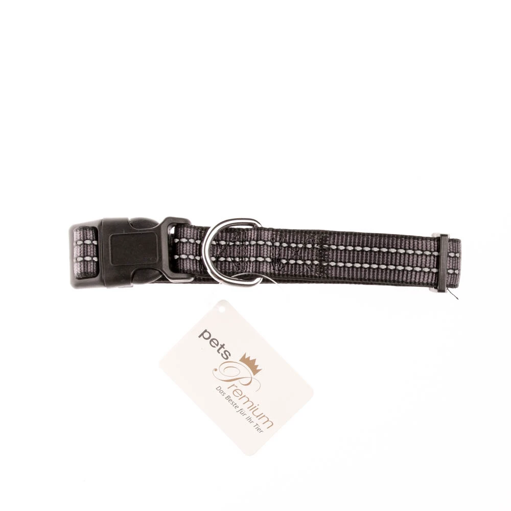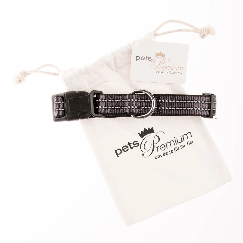 Das pets Premium Halsband in klassischem Design in schwarz-grau ist in drei Größen erhältlich und zusätzlich in der Weite individuell verstellbar. Durch die eingewebten Reflektoren-Streifen ist Ihr Liebling bei Spaziergängen in der Dämmerung und Dunkelheit gut sichtbar und somit optimal gerüstet. Das Halsband kommt in einem hübschen Jutebeutel zu Ihnen nach Hause und lässt sich optimal als Geschenk für einen lieben Hundefreund verwenden.