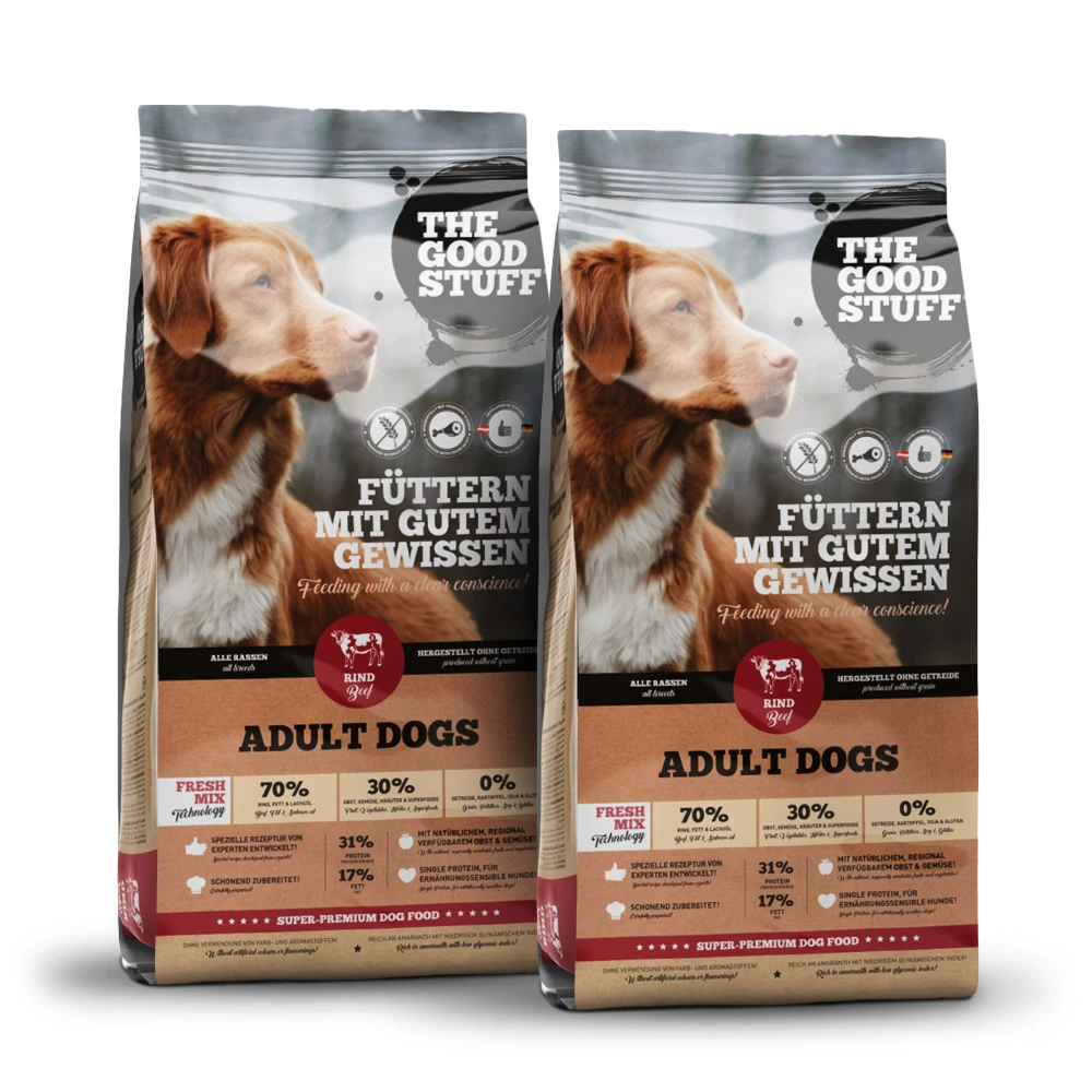 Das Trockenfutter Adult Rind von The Goodstuff ist ein innovatives und getreidefreies Alleinfutter für erwachsene Hunde aller Rassen und Größen. Die Rezeptur des Trockenfutters ist sehr hochwertig und verzichtet komplett auf den Zusatz von Getreide. Stattdessen wurde viel frisches Rindermuskelfleisch in Lebensmittelqualität sowie frisches und regionales Obst und Gemüse verarbeitet. Als Energielieferant und Kohlenhydratquelle wird ausschließlich Amaranth verwendet. Dieser besitzt einen niedrigen glykämischen Index und kann daher von Hunden sehr gut verwertet werden. Das Trockenfutter von The Goodstuff wird nach dem Fresh-Mix-Methode hergestellt. Das heißt, dass alle Zutaten ganz frisch sind und anschließend besonders schonend verarbeitet werden. Dadurch bleiben mehr Nährstoffe übrig und helfen bei einem gesunden Wachstum deines Hundes.