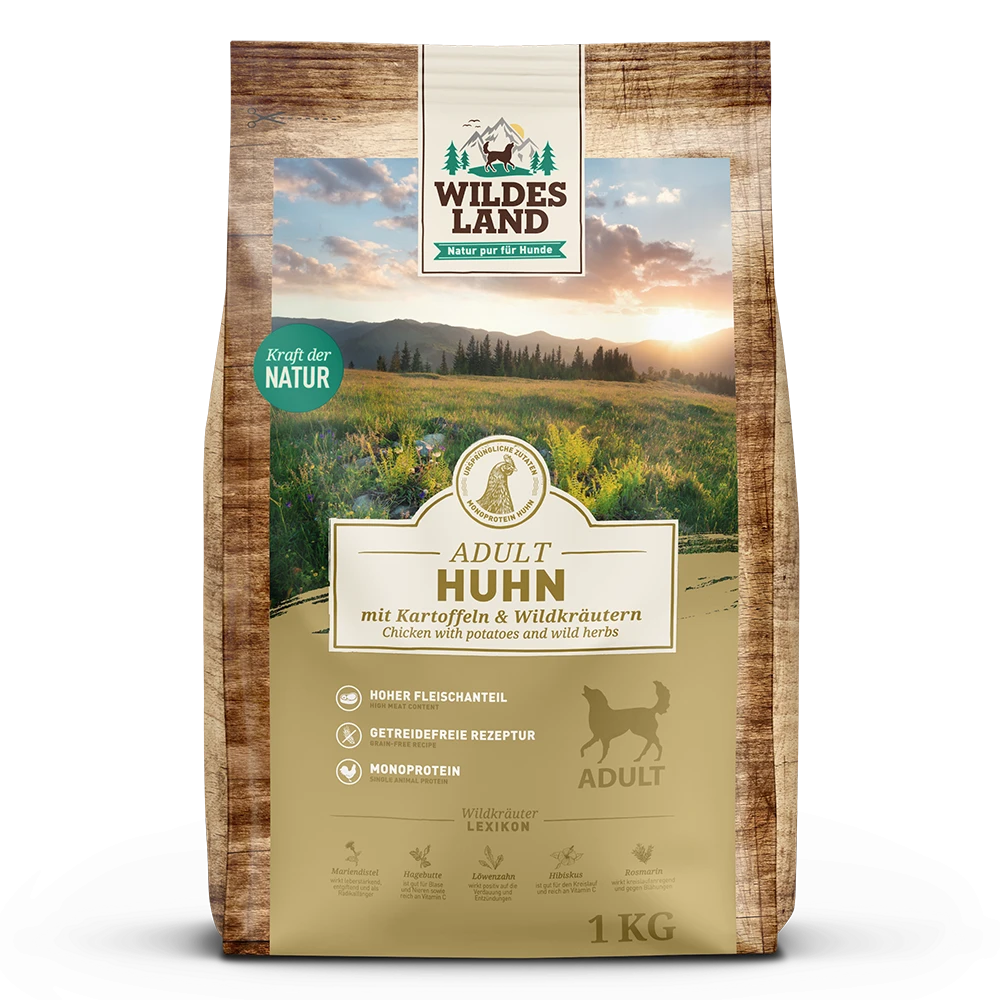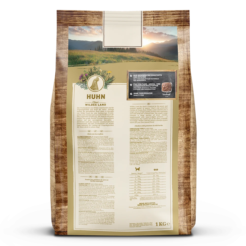 Für das Wohlbefinden und die Gesundheit Ihres Hundes ist eine ausgewogene Ernährung unerlässlich. Das Trockenfutter Huhn mit Kartoffeln & Wildkräutern von Wildes Land versorgt Ihren Hund, analog den neuesten wissenschaftlichen Erkenntnissen, mit allen wichtigen Nährstoffen und Vitaminen, die er für ein langes, aktives Leben braucht. Das Trockenfutter von Wildes Land beinhaltet viel frisches und getrocknetes Fleisch vom Huhn (40%), dessen Geschmack in einer feinen und artgerechten Komposition mit Gemüse und Wildkräutern abgerundet wird. Zusätzlich fördern die ausgesuchten, wertvollen Wildkräuter in Kombination mit Leinsamen ganz natürlich die Verdauung und das Wohlbefinden Ihres Hundes. Wildes Land Huhn mit Kartoffeln & Wildkräutern enthält Hühnerfleisch als einzige tierische Proteinquelle und verzichtet ganz auf den Zusatz von Getreide. Als Kohlenhydratquelle dienen gut verdauliche Kartoffeln und feine Erbsen. Dieses Trockenfutter von Wildes Land ist damit hervorragend auch für futtermittelempfindliche oder sensible Tiere geeignet. Natürlich ist das Trockenfutter von Wildes Land frei von Farb-, Aroma- und Konservierungsstoffen und wird zudem ausnahmslos ohne Tierversuche entwickelt und produziert. Mit Wildes Land bekommt Ihr Liebling Natur pur direkt in den Napf.