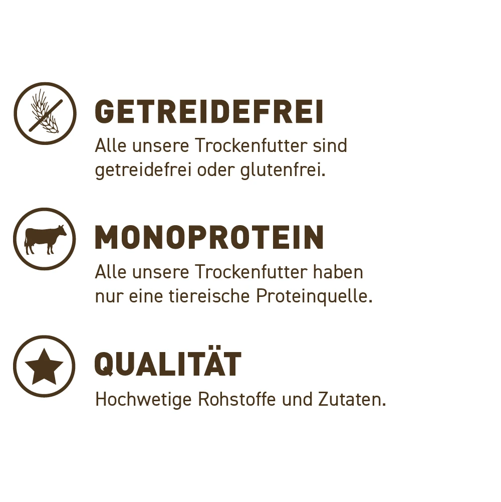 - Hoher Fleischanteil: Durch viel hochwertiges und frisches Rindfleisch sind die Rezepturen reich an leicht verdaulichen Proteinen und Fetten.