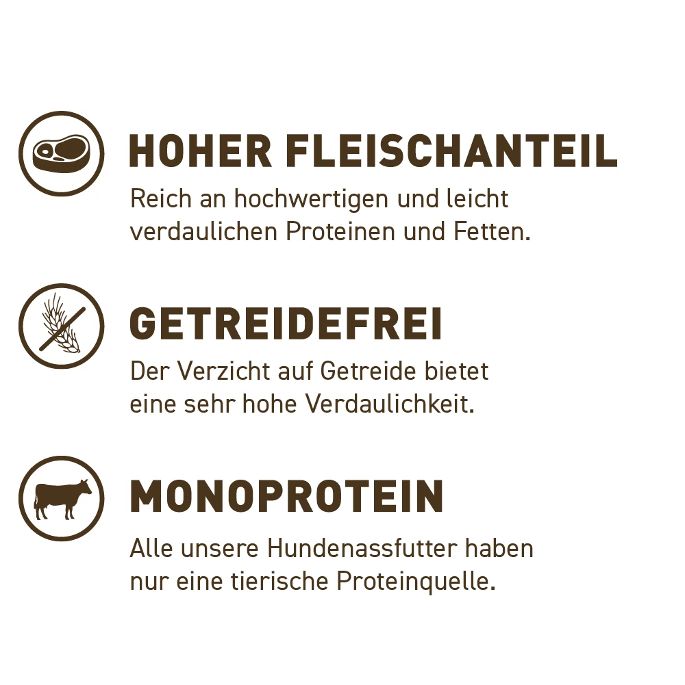 Mit einem Gesamtanteil an Muskelfleisch und Innereien von mehr als 62 % besitzt es eine ausgezeichnete Akzeptanz und Verträglichkeit. Ergänzt wird die Rezeptur nur mit Süßkartoffeln, Heidelberren, Wildkräutern und Distelöl – kombiniert nach den neuesten wissenschaftlichen Erkenntnissen. Mit dem Wildes Land Nassfutter Rind wird Ihr Hund mit allen wichtigen Nährstoffen und Vitaminen versorgt, die er für ein langes, aktives Leben braucht. Natürlich ist das Nassfutter von Wildes Land frei von Farb-, Aroma- und Konservierungsstoffen und es wird zudem ausnahmslos ohne Tierversuche entwickelt und produziert.