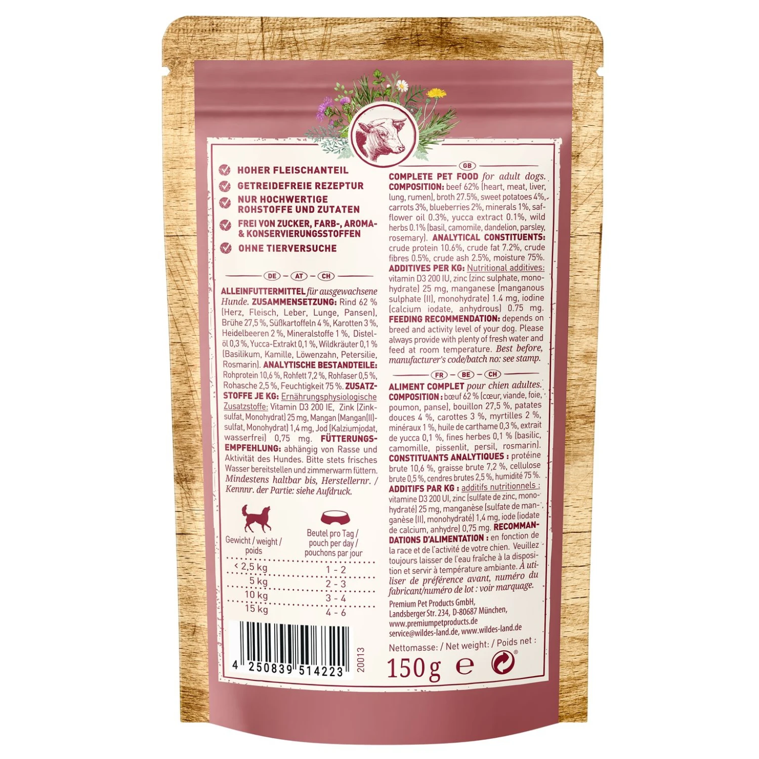Das Nassfutter Rind mit Süßkartoffeln, Heidelbeeren, Wildkräutern und Distelöl von Wildes Land im Überblick: