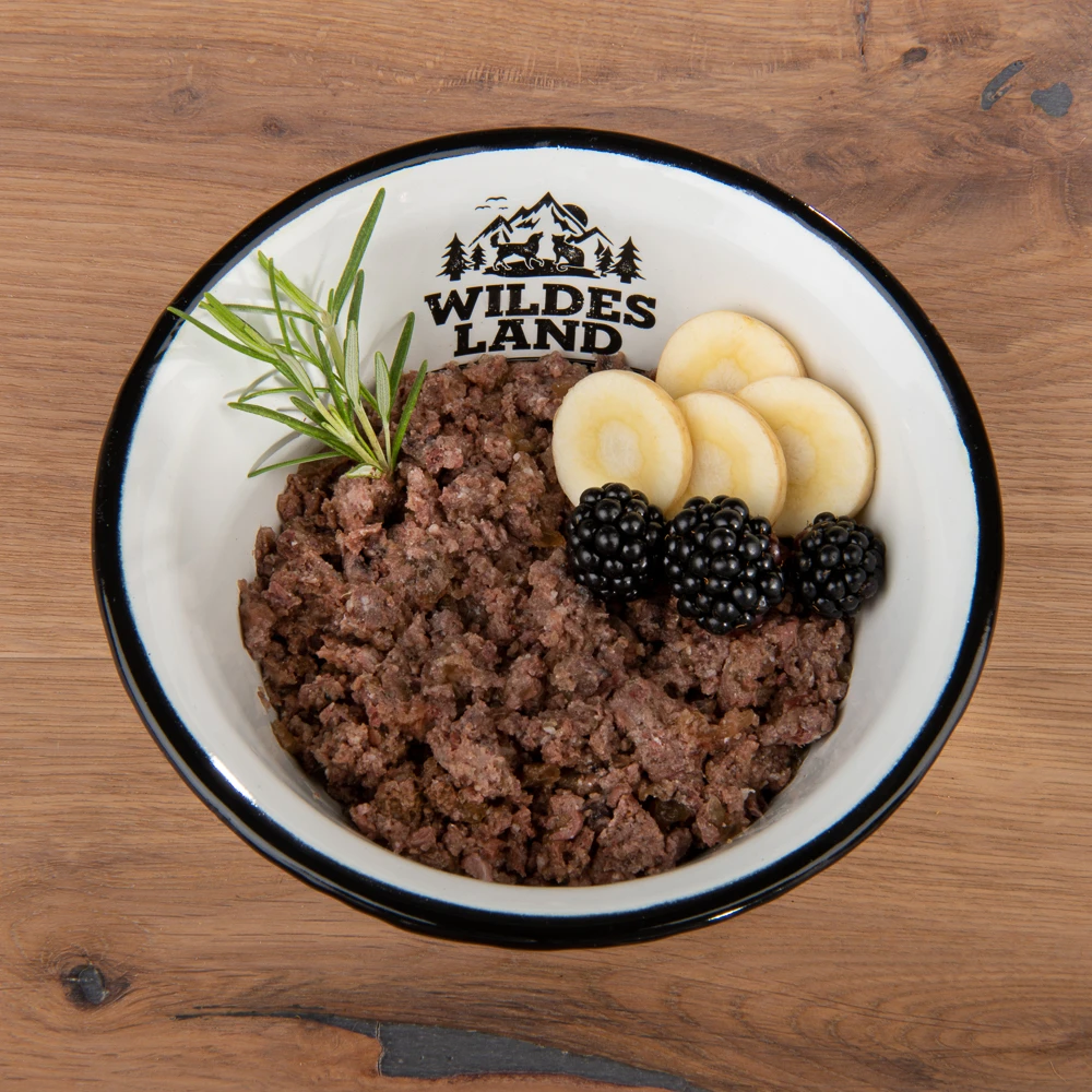 Ergänzt wird die Rezeptur nur mit Pastinaken, Brombeeren, Wildkräutern und Distelöl – kombiniert nach den neuesten wissenschaftlichen Erkenntnissen. Natürlich ist das Nassfutter von Wildes Land frei von Farb-, Aroma- und Konservierungsstoffen und es wird zudem ausnahmslos ohne Tierversuche entwickelt und produziert.