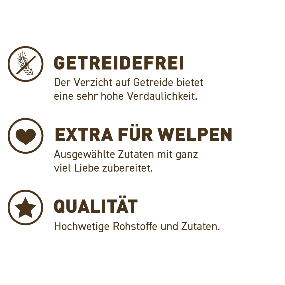 - Hohe Akzeptanz: Huhn zusammen mit frischem Entenfleisch sorgt für eine besonders hohe Akzeptanz und eine ausgezeichnete Verträglichkeit bei Welpen.