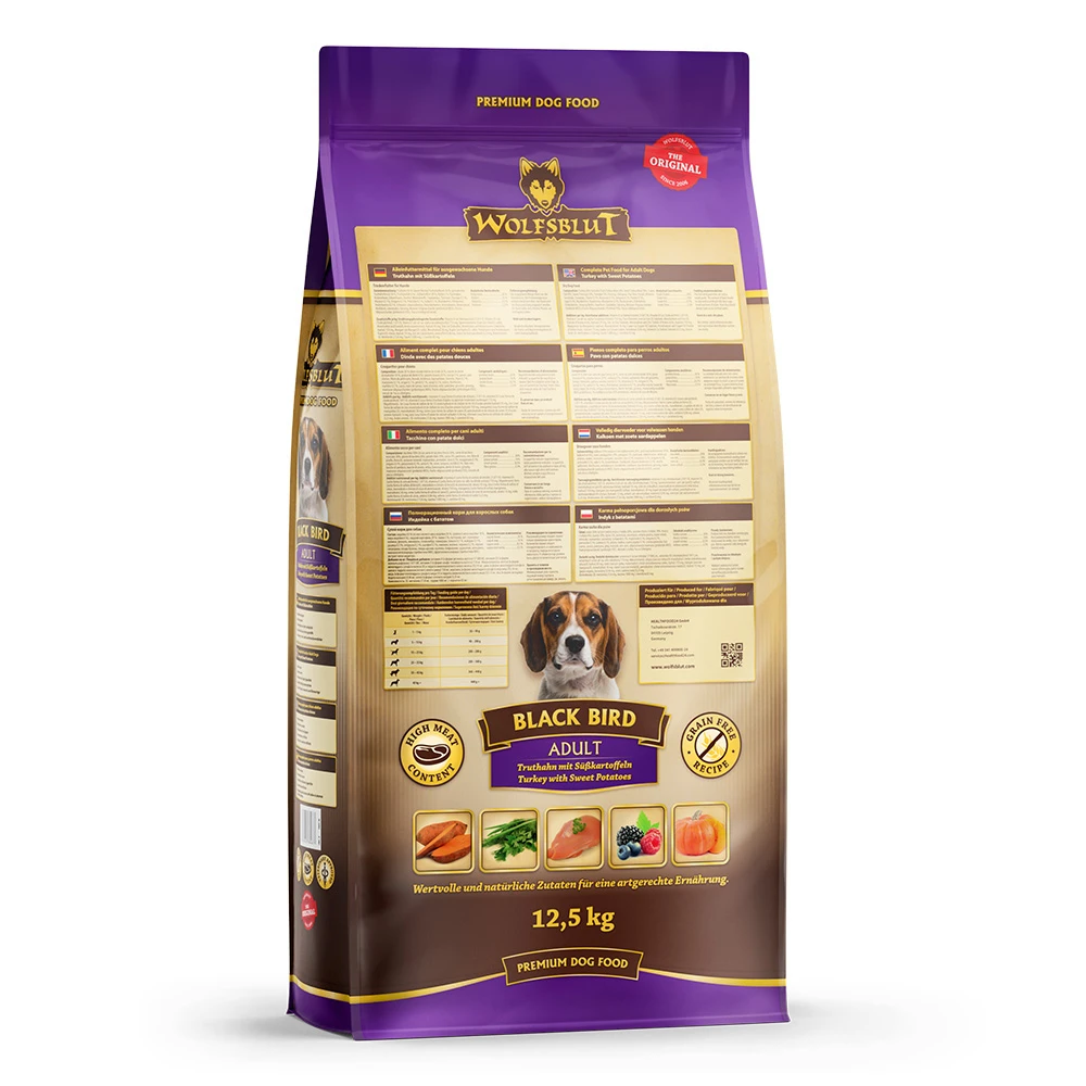 Die einzelnen Futterbestandteile von BLACK BIRD wurden zusammen mit Tierärzten, passend zum natürlichen Beuteschema des Wolfs und den Erkenntnissen zu ganzheitlicher Hundeernährung, zusammengestellt. Das Trockenfutter von Wolfsblut ist damit einzigartig. Süßkartoffeln, Holunderbeeren, Aroniabeeren sowie Löwenzahn, Topinambur und Ginseng