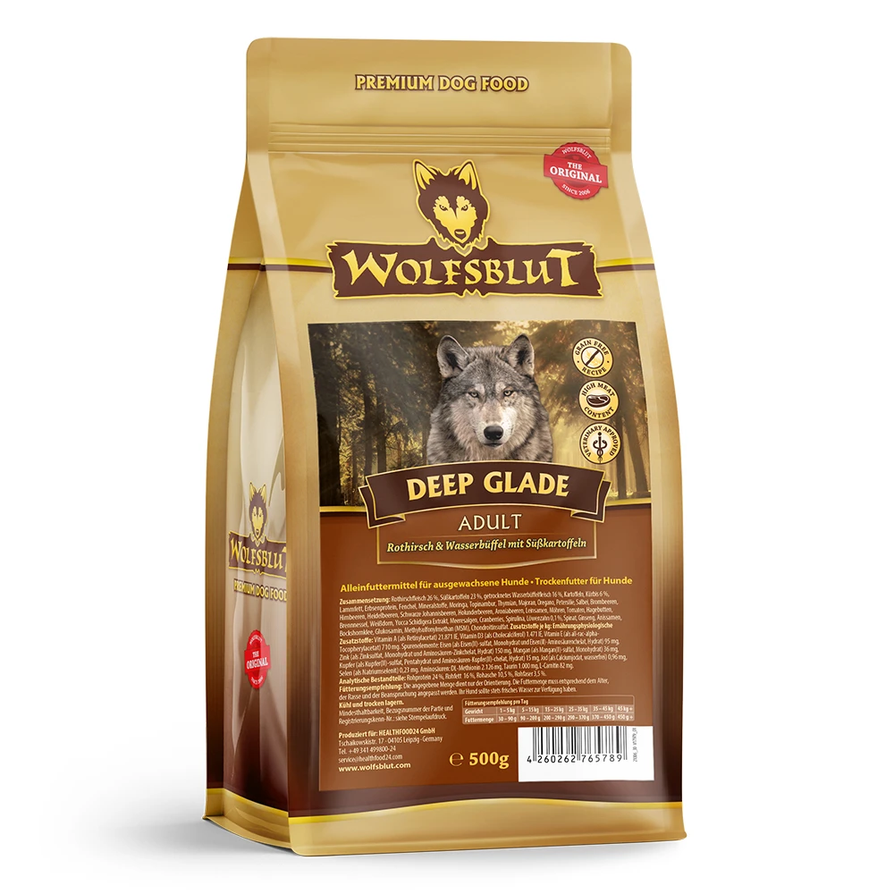 In den Rocky Mountains Nordamerikas, der arktischen Tundra, den Bergen und Wäldern Europas bis hin zu den Wüsten und Steppen Zentralasiens jagen Wölfe ihre Beute. Diese versorgt sie mit Fleisch und nährstoffreichen Innereien, aber auch mit Gemüse, Früchten, Beeren, Wurzeln und Kräutern über den Mageninhalt der Beute. Getreide gehört hier nicht dazu. So erhält der Wolf seine benötigten Vitamine, Mineralstoffe, Spurenelemente, Enzyme und sekundären Pflanzenstoffe. Da der Wolf der Urahn aller Hunde ist, orientiert sich unser Wolfsblut Hundetrockenfutter an diesen natürlichen Fressgewohnheiten des Wolfs. Es enthält viel Fleisch oder Fisch kombiniert mit Superfoods, die wertvolle Inhaltsstoffe enthalten – und das wie in der Natur, ganz ohne Getreide. Unsere Auswahl an außergewöhnlichen Fleischsorten und nährstoffreichen Superfoods baut dabei auf den Lebensräumen des Wolfs und deren bunter Nahrungsvielfalt auf. Wolfsblut bietet jedem Hund eine artgerechte und ursprüngliche Ernährung und mit seiner Sortenvielfalt ist für jeden etwas dabei, das er verträgt. Die Rezeptur von DEEP GLADE ADULT Trockenfutter verbindet die Nahrung des Wolfs mit den neuesten wissenschaftlichen Erkenntnissen über richtige Hundeernährung.